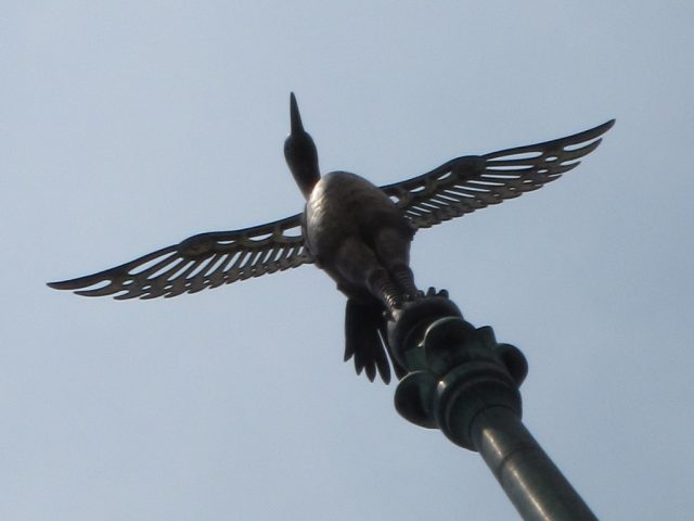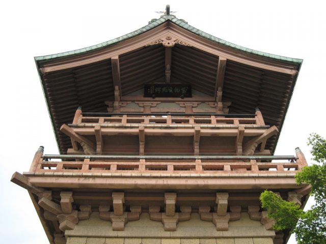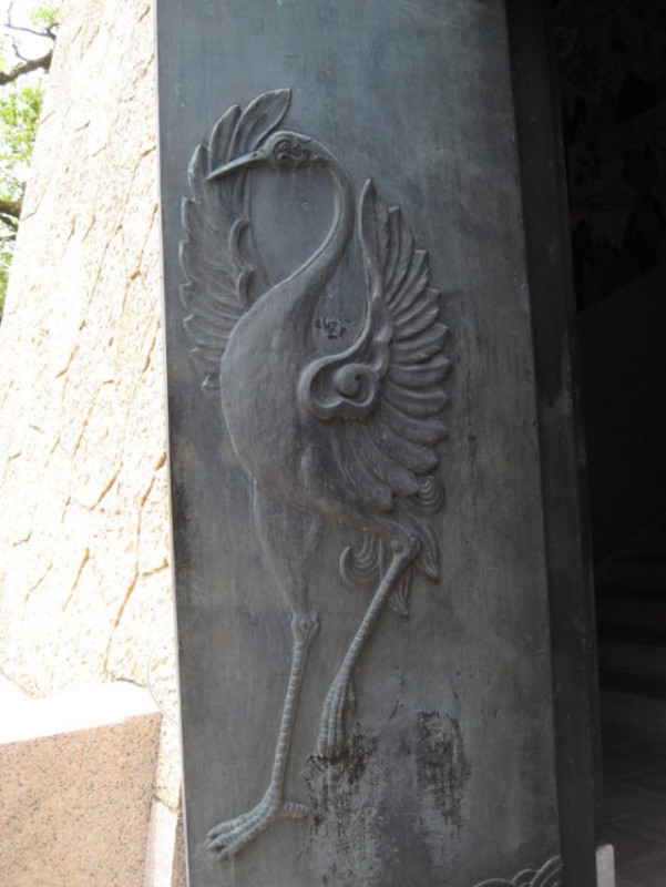 扉の鶴と同じく、楼閣の相輪が、遠くから眺めると「鳳凰」に見えます。しかし、本当は「金鶴」になっています。幼名と雅号を由来を知っていれば鶴も納得です。画像からわかるように、よく見ると鶴の形です。