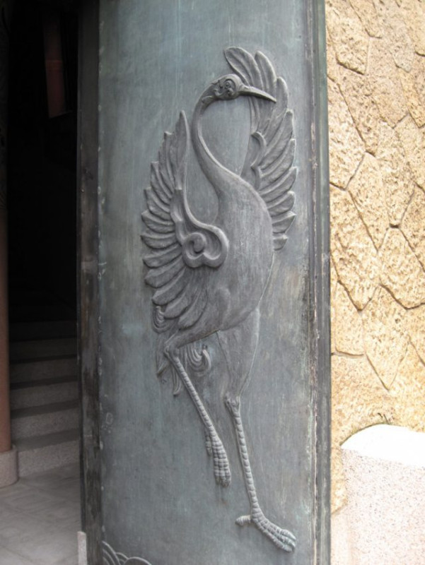 扉の前の獅子は、大倉土木の獅子、扉の鶴は、大倉喜八郎の幼名「鶴吉」と雅号「鶴彦」に「鶴」があるので、鶴がモチーフになってます。
