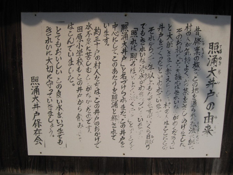 場所は、四條畷と生駒市の府境県境にあります。 この照涌大井戸は、昔話もあり弘法大師も登場する由緒のある湧水です。 今では歴史保存会が管理されてます。詳しくは、環境省、四條畷市などのウェブサイトで確認してください。