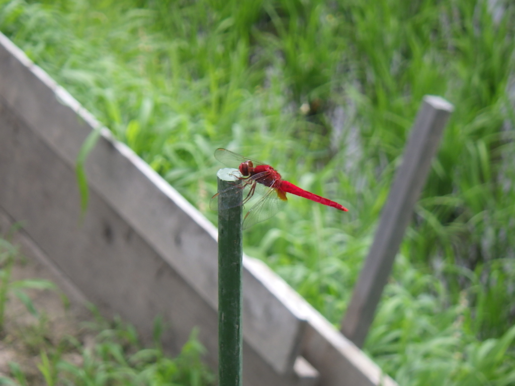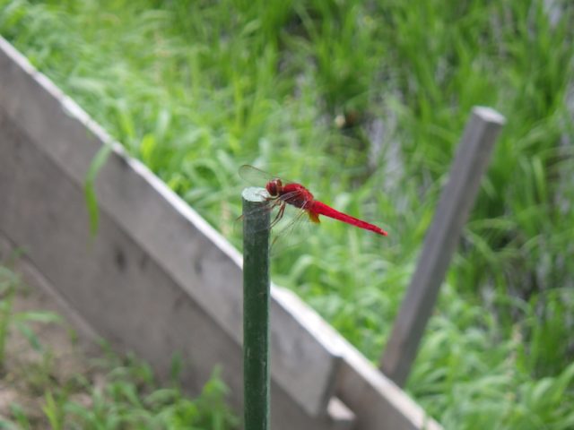 田んぼを散策してると、なんと、赤とんぼと出会いました。やはり、秋ではないので、一人ぽっちで少し寂しいそう。