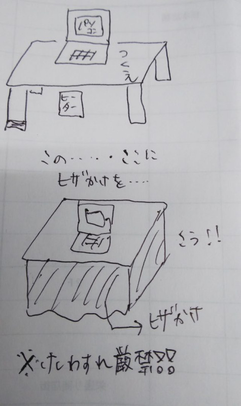 こんにちは! センター試験の英語の第一問のような人間になりたいなあと 本日ニュースを見ながら思いました。※なぜこれを描いた人は、なぜ筋肉をつけたんだろう…(個人的には全く嫌いではないですけども・・) それはともかく、 受験生のみなさま、センター試験、ほんとうにおつかれさまでした。。 とても大事な試験。ひどく緊張されたのではないでしょうか・・ 実は私自身、緊張に弱いです。未だに何かの試験のたびに手が震えます。そのようなときは 「できる、大丈夫」「できることはした」「この消しゴムおいしそう」 など、自分と対話しています。※最後の思考までたどりついたころには緊張がとけます。 先日の雨のためか、一段とさむくなってまいりましたね。 本試験も先にあるとおもいます、どうぞ身体にお気をつけくださいね。 寒さといえば・・ みなさま寒さ対策どうされていますか? 基本的に外へでるときはマフラー・手袋・帽子や耳あてなどで 対策されているとおもいますが「室内」も冷えますよね。。 室内の寒さ対策・・少し調べてみましたのでご紹介いたします。 家での寒さ対策・・ ①保湿・保温のためのカーテンをつける。 手軽に2重窓のように外気をふせぎます。一度あったまるとあったかい。 ②カーペットをひく(苦手な方はマット) 下の方に冷気がたまるので、床はとっても冷たいです。床の冷たさが身体に伝わらないようにできます。 ③ソファーや椅子などにクッションやも毛布をかぶせる。 レザーなど冷たいですよね。少し毛布をかぶせるだけでもぜんぜん違いますよ。 ④加湿する 湿度があがると、あたたかく感じます。風邪予防にもなりますし、加湿は冬は大事ですね。 ⑤ドアをしっかり閉める 隙間があるとそこから冷気が入り、暖房が効きづらくなります。部屋から出るときも こまめに最後まで閉めると暖かさを保つことができます。 さて、みなさまの家ではどのような寒さ対策をされていますか? 調べてみると暖房以外にも工夫できること案外多いですね。 ぜひお試しください。 ・・ちなみに会社では・・ 椅子にクッションを置くととてもあたたかく快適です♪ 今はUSBにつなげられるあったかクッションも売っていますよね。 机の下にミニファンヒーターを置いているので冷えやすい下の方も・・ぽかぽかです。 ちなみにひざかけ・・これ、お客さんいらっしゃったとき、モタついて 最近していなかったのですが、調べているうちにいいアイデアがありました。 いっしょうけんめい絵にかいてみました(ヒザかけがヒゲかけにみえますね)。