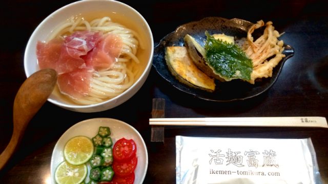 さっそく、限定メニューの「富蔵流ひやかけ」と「野菜の天ぷら」を食べてきました。 おうどんのお出汁は、昆布を水出ししたと店主に教えていただきました。癖や雑味がなく、生臭みも極限まで抑えれられ、夏の暑さで味の強い濃いものが受け付けられない人にも美味しく頂ける味わいでした。それでは、少し物足りなさを感じる人には、トッピングされてる生ハムの塩加減が絶妙の塩梅でした。