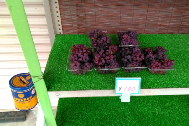 ぶどう狩りの案内のよこに、なんと! 無人販売がありました。デラウエアがなんと100円!びっくりです。思わずこれも買いました。