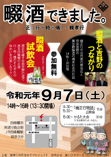 こんにちは! 四條畷のイベント情報を探していたところ 四條畷のお酒「畷酒」ができたということで お酒がお好きな方にぜひ知っていただきたいと思い、 調べてみました。 畷酒 ―正が無い(しょうがない)酒「行」「時」「儀」 敗戦必至の戦に、最後まで忠臣としての道を貫き、命をかけて息子たちにその道を説いた 稀代の英雄、楠正成。父の想いを受け継いだ親孝行な息子たちの名前から一文字ずつ、「正」が無い(しょうがない)お酒の名前としました。― 公式HP「四條畷のお酒」より引用 https://nawatezake.com/ お酒の種類は3種。 長男「正行」まさつら。 次男「正時」まさとき。 三男「正儀」まさのり。 長男次男三男とそれぞれの名前をとっているのが 面白いですね。まさに「正ブラザーズ」! 「親孝行の町、四條畷」のお土産として、地域の知名度向上、活性、発展に貢献、そして 地元孝行に繋がること想い、作られたお酒だそうです。 なんだか飲みたくなりませんか。 飲みたいですよね? ・・・ 飲めます。 今週の土曜、栄通り商店街にて 試飲会がおこなわれるそうです! ↓ ↓ ↓ 畷酒できました。 9月7日(土) 14:00~16:00(会場は13:30) 参加費 無料 四條畷市 栄通り商店街(JR四条畷駅 徒歩3分) チラシ情報