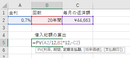 エクセルの財務関数を使うと簡単に出せます。PV関数を使います。プレゼントバリューと読みます。 PV関数内の注意点 利率:金利の事です。計算は小数点で行います。年利2%で計算するときに「2」にすれば200%の意味になります。また、一回の返済毎に金利計算されるので、年利2%なら月利に直す必要があります。ここでは、12で割っています。「数値の書式」が標準なら割合を小数点で表記。書式がパーセントなら。書式がユーザー定義で数値に%が出るようになっている場合なども注意してください。書式が標準で年利2%で計算する場合。2%=0.02なので0.02です。そこから月利に直すと0.02÷12≒0.0016666と割り切れないケースも多いのでセルには0.02/12と入力します。 書式がパーセントの場合なら入力するのは、2でも2%の意味になってます。だから、月利をセルに入力するのは2/12です。 期間:返済回数が何回あるのか入力します。年間ならば、12を掛けた月間に直します。逆に利率と期間を年払いに単位を合わせる事もできます。四半期払いなどでもできますが、住宅ローンは月々なので満月数で合わせています。 定額支払額:ここでは月々の返済額を入力します。画像をよく見れば、マイナスが掛けられているのが分かると思います。このマイナスはなくてもかまいません。ない場合は、PV関数の返す値がマイナスになります。 参考に「=PV(A2/12,B2*12,-C2)」 次のシミュレーションは どれぐらい借入したいかから考えたパターンです。 残りの変数は、返済期間と住宅ローン金利です。このから毎月どのぐらい返済しなければならないかを算出してみます。