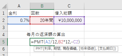 同じく財務関数からPMT関数を使います。ペイメントと読みます。 PMT関数内の注意点 利率:PV関数の時と同じで金利の事ですが、返済回数毎に計算する金利を書式が標準なら小数点で入力します。通常住宅ローンの金利は年利で表記され、返済は毎月です。なので月利に直すために12で割ることを意識するように入力します。 期間:住宅ローンなので返済期間の満月数で答えます。 現在価値:ここには、マイナス表記で入力します。現在価値がマイナスということは、その負債がある意味になります。 将来価値と支払期日はここでは省略します。 PMT関数が返す値は、設定された回数に金利を掛けて負債をペイするには、一回毎にいくら当てればよいかが得られます。 参考「=PMT(A2/12,B2*12,-C2)」 ※ここでのシミュレーションは、おおよその慨算です。実際には、閏年の計算があったり365日もしくは366日分の28日29日30日31日となる場合や金融機関によっては月利単位計算の12ヶ月分の1ヶ月など、ここで紹介したシミュレーションとは誤差が生じます。また、2回目以降の支払いがキリの良い一定額になるように、初回の返済で金額を調整するなどあります。予めご了承ください。
